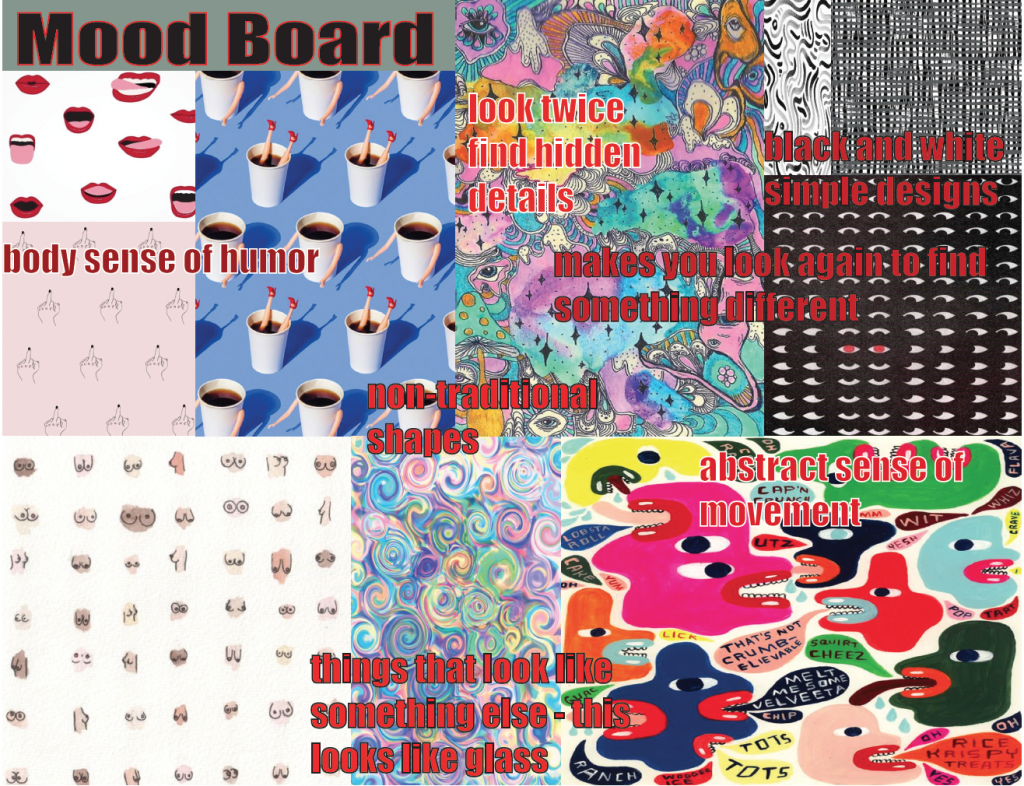 For this next project for my illustration class, we focused on repeating patterns and how they are used in context with surface design. Our assignment included creating a mood board that focused on the aesthetics we wanted to achieve within our seamless pattern. For this specific project, I wanted to focus on different inspirations I find from everyday life. I wanted to focus on my sense of humor and various oddities that I find amusing. I wanted to take a different direction within this assignment and play along with natural creations such as doodles you would find in a notebook. I heavily enjoyed creating a mood board because I was able to focus on what exactly I wanted to feature for my surface design pattern.