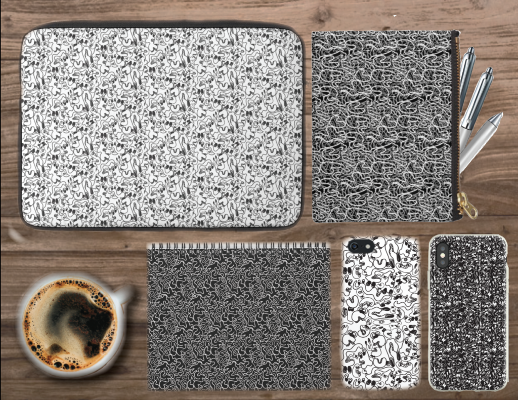For my mockup for my products, I stumbled across RedBubble, which is a website that you can apply your own art and patterns in order to make a profit. I was looking for templates that featured white cases for iPhones and computers and stumbled across various products that one can actually buy with this pattern I created. Various products that I was interested in looking at included two different styles of iPhone cases, a simple laptop case that could work for various devices, a pouch, that could be in this instance used for pencils or charging cords/headphones, and a spiral notebook. I included the notebook into my mockup because I thought it would be a good reference for size.