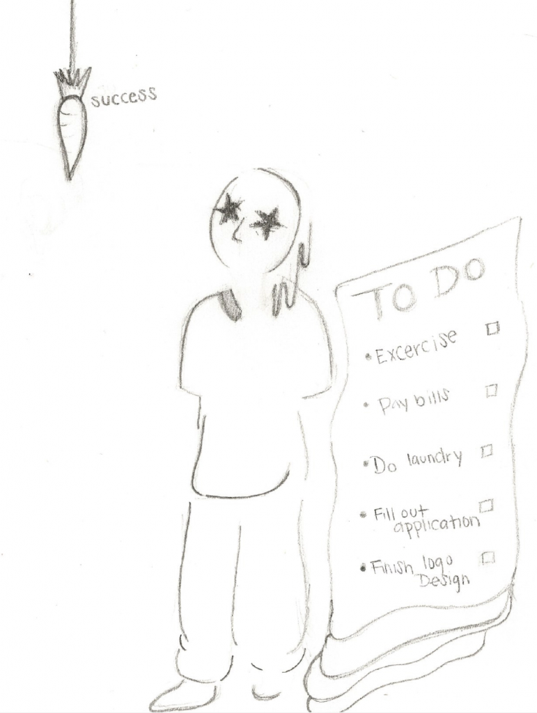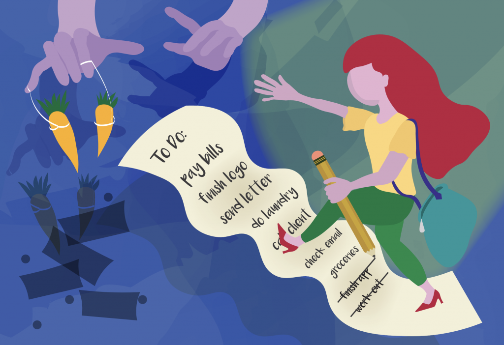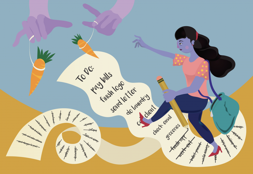 With this editorial project, I experimented with a style of illustration that is not realistic, for example, the purple skin, the facial structure and the giant pencil; yet this style is still able to tell a visual story. I played with the sense of exhaustion through the character’s facial expression and bags under the eye. I expressed urgency through the posture, by having the character reach towards the carrots which represent the dreams/ success that one wishes to accomplish by completing their to-do list. The bag dangling behind the character also represents a sense of rushing to reach the “finish line”. One does not necessarily have to read the article to see a relentless character reaching towards a goal.