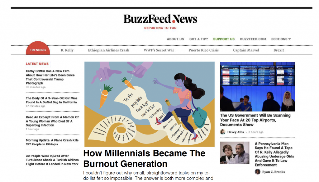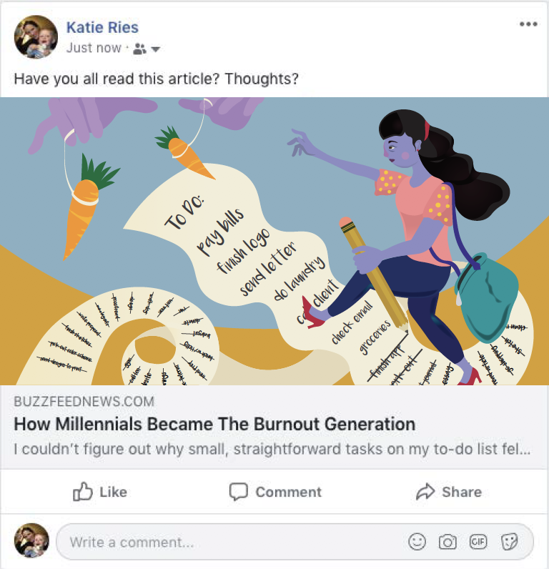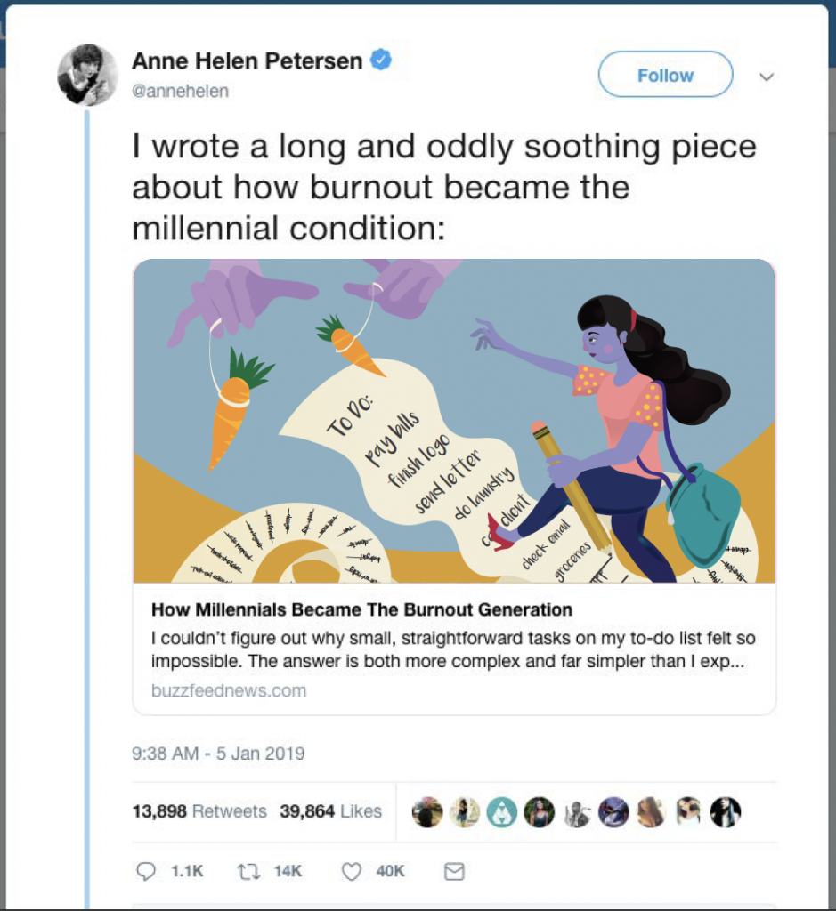 For our editorial assignment, we read the article How Millennials Became The Burnout Generation, written by Anne Helen Peterson. As I read this article, I highlighted the following key words: anxiety, scared, relentless. These were some of the adjectives Anne used to describe millennials. Yet, the phrase that stood out to me the most was: “… I’ve internalized the idea that I should be working all the time.” This phrase was the idea that inspired my editorial piece.