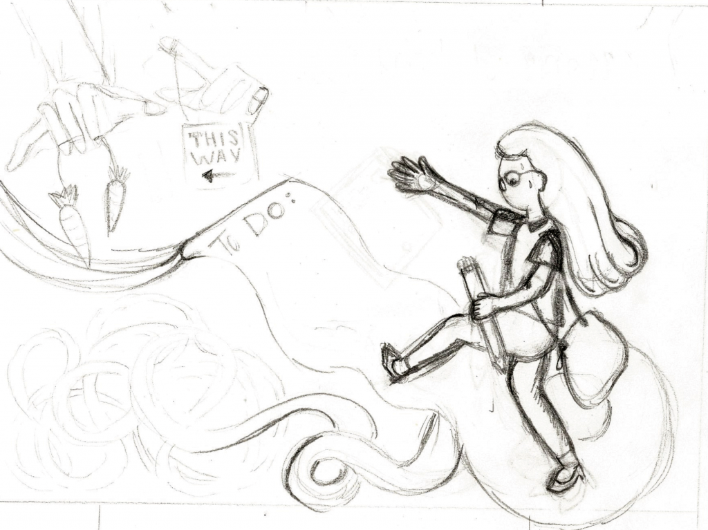 Sam here. Nice job Carla! I almost wonder if the girl climbing the TO-DO stairs is enough, without the need for the hands and carrots. Ask yourself, if you removed that, would the idea still come across? Would it come across in an even quicker way? Smaller details like the bag under the eye could also be greatly exaggerated to make sure that reads. A trick to keep in mind is that whatever thing you’re doing, do it hard and do it more. If you want to make sure she looks tired, then really emphasize that. Mainly because smaller details get lost to the viewer; they should take a quick look, get the main concept, and then they’re on to the article most likely. For this same reason, many of the items on the to-do list might not even register really; you could try an exaggerated version where the “TO DO” is the most prominent thing on the list by far, and the specific items are less important to read in detail, maybe just squiggly lines for example! Good thinking on the color of the skin and hair; in editorial work these days it feels important to make sure if you include humans, they can be vessels upon which any viewer can project themselves; Good instinct!