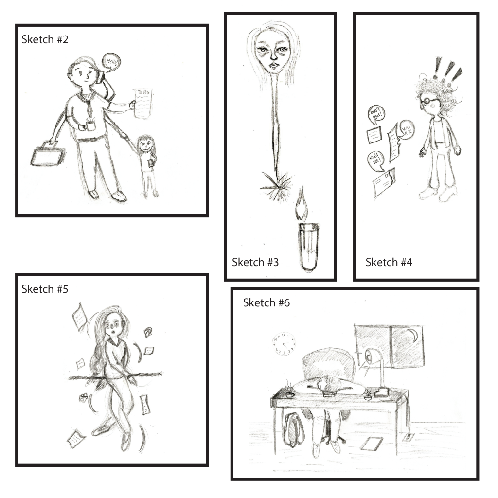 Below you can see some of my initial drawings, these drawings were directed towards specific emotions that daily tasks could provoke in the millennial generation. For example, sketch #1 is representative of anxiety, through the individual’s curled like posture.