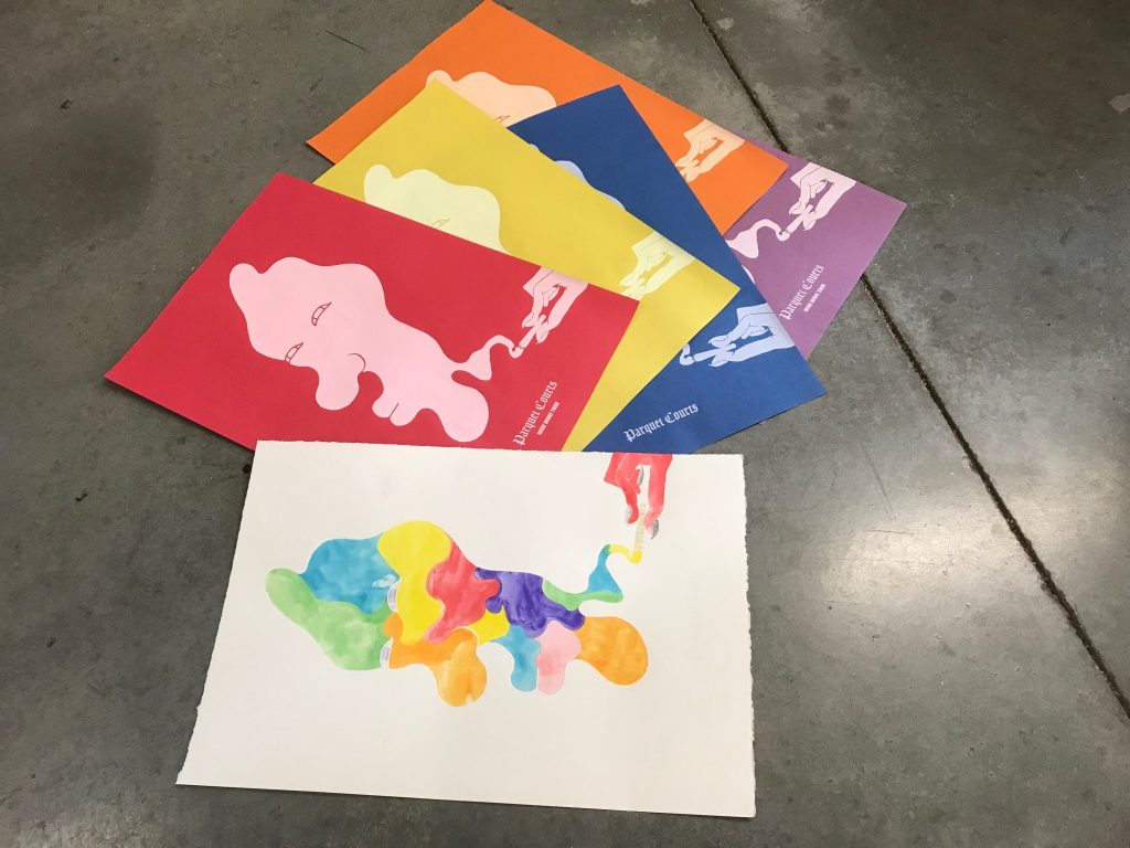 I then began listening to different music, and found myself looking at the album artwork for Parquet Courts new album WIDE AWAKE. I found that the general simplicity and motion occuring in it was aligning with some of my other current works. This simple poster was inspired by some of Sam Smith’s posters who we had talked to as a class previously in the semester.