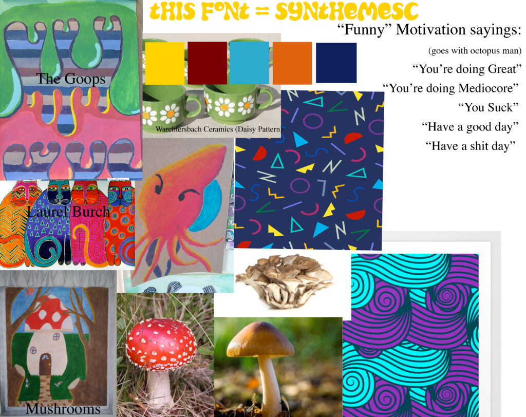 To start this project I created a mood board. I included 3 of my own drawings as inspiration but also drew inspiration from different types of mushrooms as well as colors that Laurel Burch used in her designs. I also included Memphis style pattern in my mood board because I liked the simplicity as well as a pattern called “Japanese Aesthetic Pattern Art Print” because I liked the flow. Ultimately I didn’t use elements from these two patterns with in my patterns because I felt there was no need. At first I felt that my theme wasn’t cohesive but after I put all of my elements together I felt better about the direction I was going.